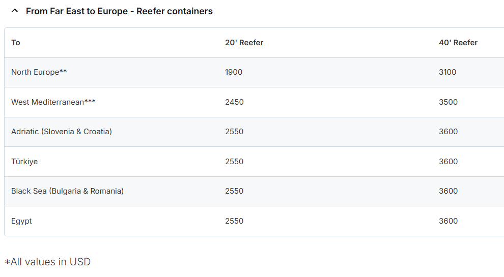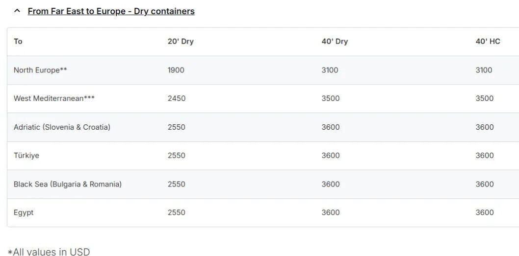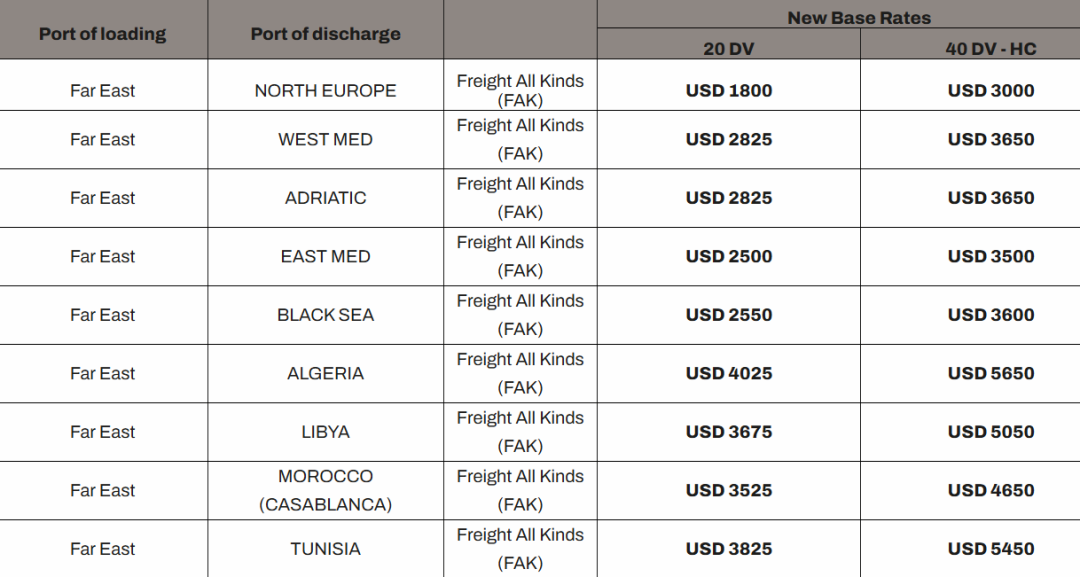 其中,MSC宣布,自2025年11月15日起生效(直至另行通知,但不超过2025年11月30日),从所有远东港口(包括但不限于日本、韩国及东南亚的港口)至北欧、地中海(包括西地中海、东地中海、亚得里亚海及北非)和黑海港口,将实施以下新的运费费率。