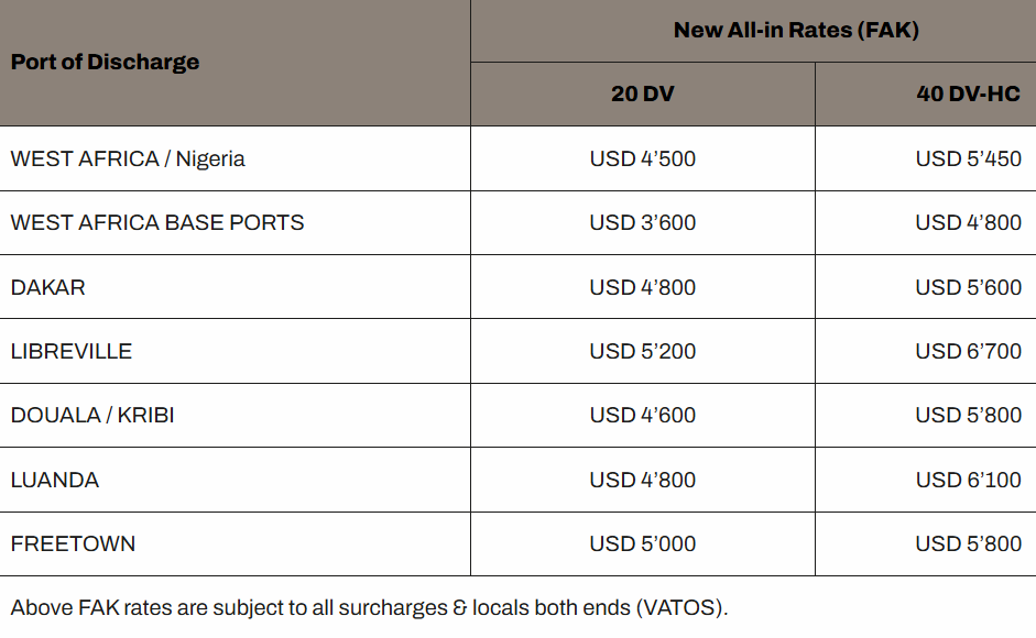 MSC还宣布,自2025年11月15日起生效(直至另行通知,但不超过2025年11月30日),从所有远东港口(包括但不限于日本、韩国及东南亚的港口)至所有西非港口,将实施以下新的运费费率。