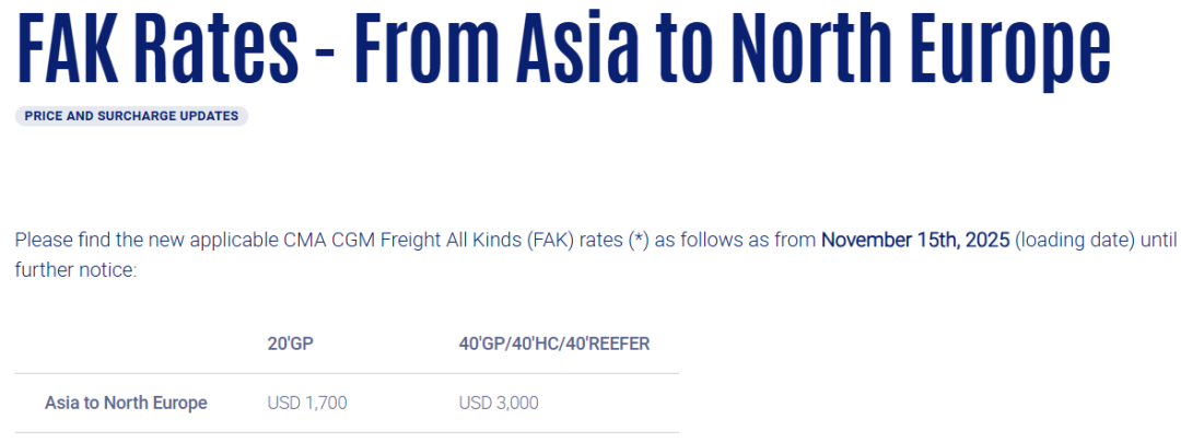 此外,达飞也宣布自2025年11月15日起,亚洲-北欧FAK费率调整为:小柜1700美元、大柜3000美元。