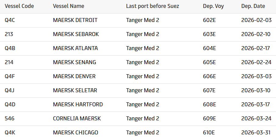 而“Maersk Detroit”轮602E航次于2026年1月10日从北查尔斯顿出发,成为首个使用苏伊士运河航线的东行航次。