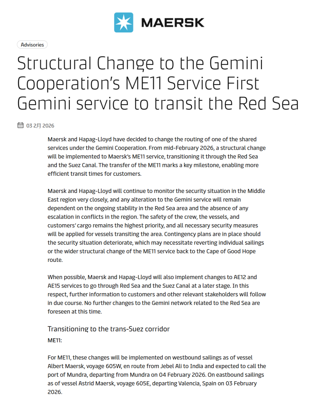 图源网络 侵删 这意味着,在长时间绕行好望角之后,两大航运巨头开始正式“试水”回归苏伊士运河。 图源网络 侵删 哪些航线将首批回归? 根据官方通知,本次调整并非全线回归,而是采取了“分阶段、有限度”的策略: 图源网络 侵删 西行: 由 “Albert Maersk” 轮(航次 605W)执行,预计2月4日从印度蒙德拉港(Mundra)出发。 东行: 由 “Astrid Maersk” 轮(航次 605E)执行,已于2月3日从西班牙巴伦西亚出发。 最高安全警戒:海军护航! 业界最关注的安全问题,马士基与赫伯罗特在声明中明确强调:“所有过境红海的航次,都将得到海军的安保保障(Naval Assistance)!” 图源网络 侵删 两家公司均表示,虽然当前局势仍具挑战,但经过全面安全评估及护航力量的介入,目前具备了初步复航的条件。 后续还有更多航线? 公告中预留了进一步扩张的信号。赫伯罗特表示,在条件允许的情况下,后续阶段将考虑调整 SE1 和 SE3 航线;而马士基则提到了 AE12 和 AE15 航线回归红海的可能性。 图源网络 侵删 马士基与赫伯罗特的此次“回归”,无疑为缩短航行时间、降低物流成本带来了曙光,但随之而来的保费调整及局部安全变数仍需警惕。