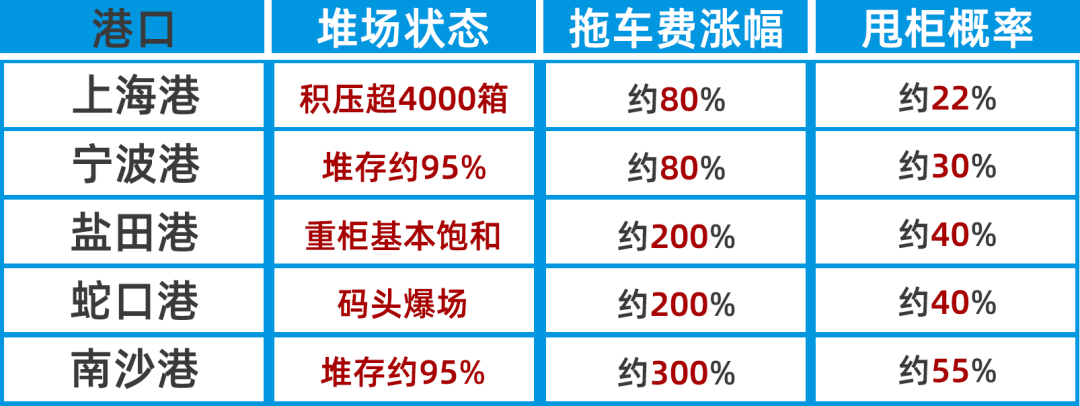 全国主要港口严峻拥堵!爆舱、甩柜、落箱与拖车费用大幅上涨