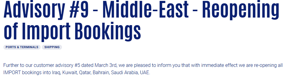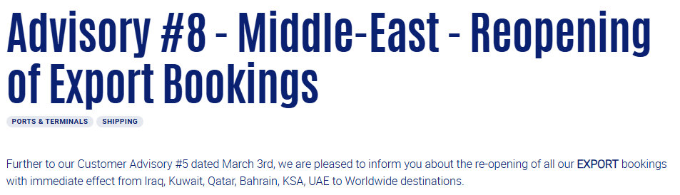 3月11日,达飞(CMA CGM)发布了两份关键咨询公告,恢复中东地区的进出口订舱服务。