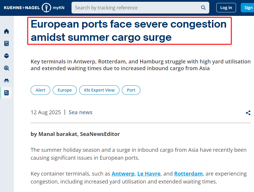 近期,由于夏季假期和来自亚洲的入境货物激增,欧洲港口面临着严重拥堵。